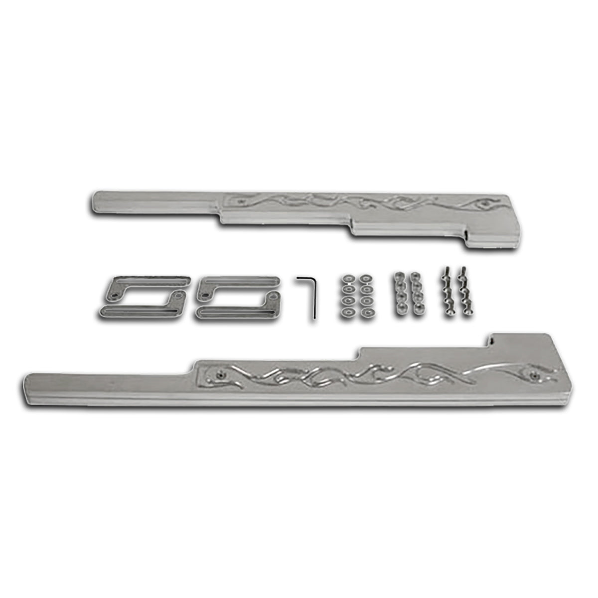 Universal flamed polished billet aluminum wire loom set. These looms can handle up to a 9.5mm wire and come complete with four L-brackets that are adjustable. All the necessary hardware for installation is included. Will not fit center bolt valve covers.